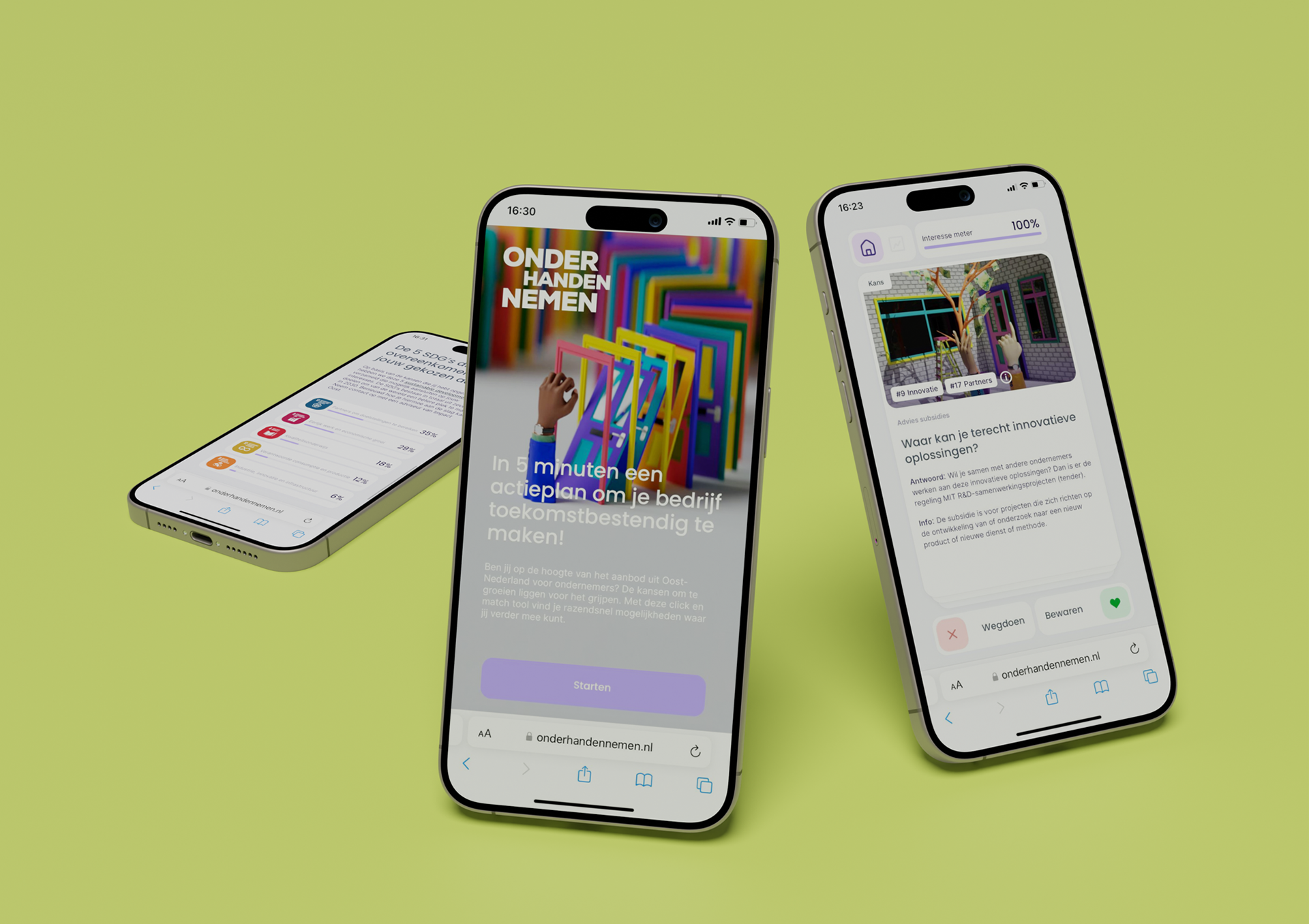 In opdracht van de provincie Overijssel en in samenwerking met Impact Oost ontwikkelde ik de webapplicatie Onder handen nemen. Met deze applicatie komen ondernemers razendsnel in aanraking met het aanbod voor impactvol ondernemen in Oost-Nederland. Binnen vijf minuten krijgen zij de kans om een actieplan op te stellen dat aansluit op de toekomst van hun onderneming. Dit actieplan is na afloop direct te downloaden.